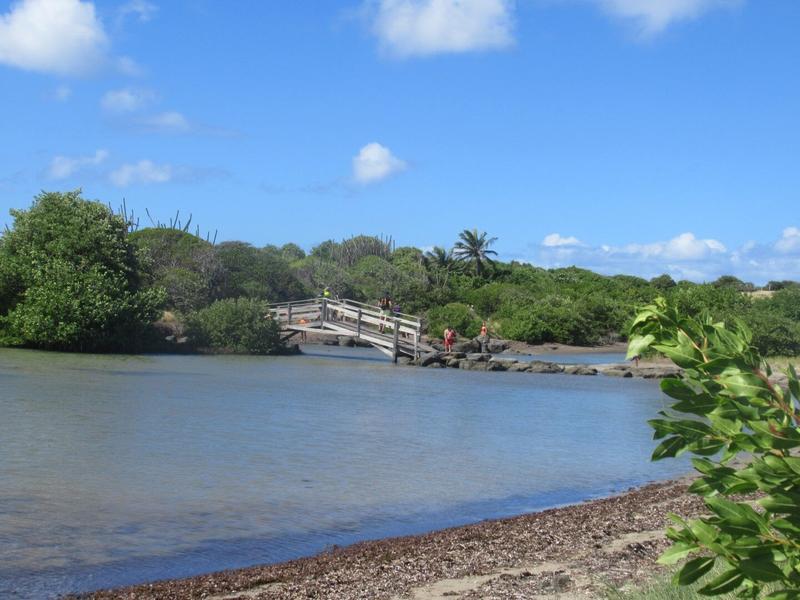 Nous nous mettons en route vers le sud, direction l’extrémité sud-est de l’île, plus bas que Sainte-Anne, du côté de la Grande Anse des Salines. Nous sommes le dernier dimanche des vacances d’hiver, il y a du monde mais nous trouvons rapidement une place sur le chemin caillouteux et chaotique qui nous mène au début du sentier de randonnée à travers la Savane des Pétrifications. Nous commençons la balade à travers un sous-bois qui longe la mer et débouche sur quelques micro-plages désertes. Arrivés à un pont, précédés de rochers permettant de passer les deux bras de rivières, nous quittons Laura, Valentin et Arthur qui font marche arrière pour trouver un endroit où se restaurer.