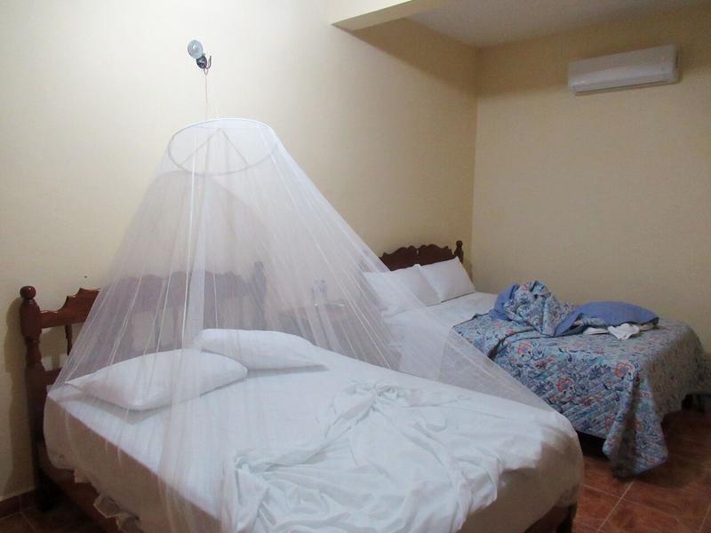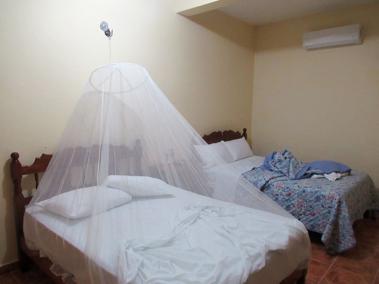 En fin d’après-midi, nous arrivons enfin dans la petite ville de Xpujil, traversée par la nationale que nous suivons depuis le début de la journée. Xpujil n’est vraiment pas grand et nous trouvons assez rapidement notre hôtel dans l’une des rues. Pour la première fois, l’accueil que nous recevons est un peu froid… Cet hôtel de quelques chambres est tenu par une famille et les enfants ne se battent pas pour s’occuper de nous 😊 La plus âgée des filles se dévoue mais personne ne parle un mot d’anglais. On est bien d’accord, le vrai problème est surtout qu’on ne maitrise pas l’espagnol, mais c’est la première fois que nous avons tant de mal pour nous faire comprendre. Nous finissons par recevoir la clé de la chambre pour nous installer. A peine rentrés et les sacs posés, on remarque qu’un gros cafard est caché dans un coin ! On demande à notre hôte de venir nous aider et elle le balaie simplement vers l’extérieur. Ça nous met directement à l’aise 😅 En plus, les moustiques ne sont pas loin, ils sont nombreux et ils ont faim ! On ressort immédiatement la moustiquaire qu’on n’avait plus sortie depuis notre départ de Martinique 🦟
