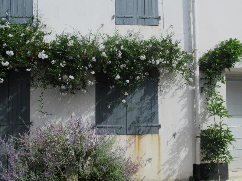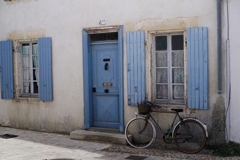 Sur la route, on voit de nombreuses vignes où pendent de belles grappes de raisins, quelques marais salants, de belles maisons du même style que nous avions vu à Noirmoutier : murs blancs, belles tuiles de couleur allant du brun à l’orangé et ces beaux volets peints. Il y a également beaucoup de vélos, moyen de locomotion très prisé sur l’île.