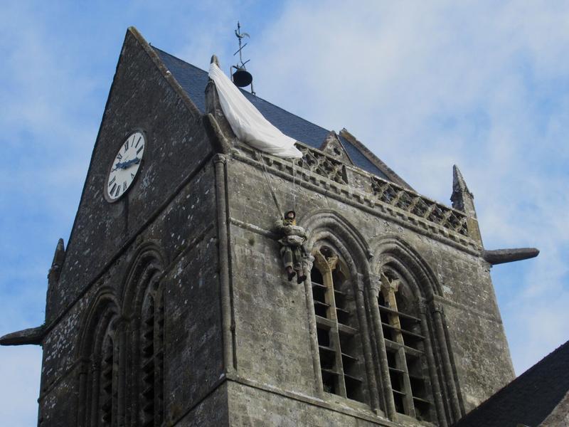 Nous commençons par la petite ville de Sainte-Mère-Eglise, connue pour son célèbre parachutiste resté coincé au clocher de l’église.