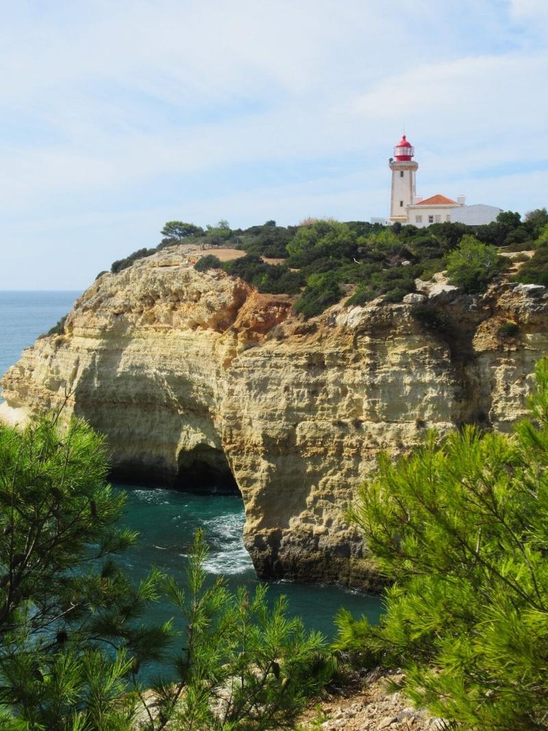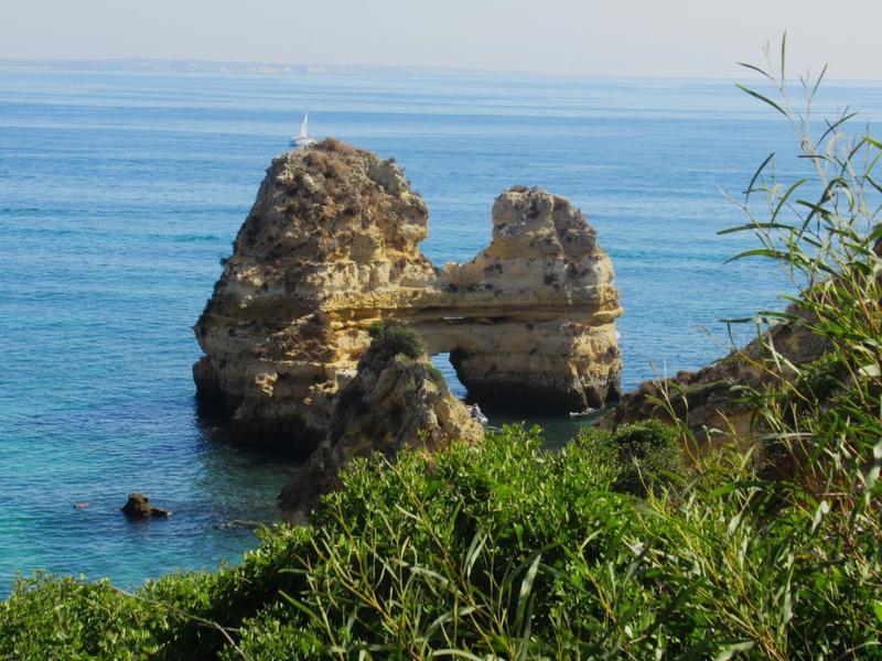 Le temps était un peu voilé, ce matin et presque frais (on s’entend bien, il fait toujours chaud mais un peu plus respirable). Nous profitons de ce temps pour nous mettre en route pour une petite randonnée des sept vallées suspendues (Percurso dos Sete Vales Suspensos). Le temps d’arriver au point de départ, il fait 30° mais nous ne baissons pas les bras et entamons cette randonnée qui longe le littoral à flanc de falaise depuis la Praia do Vale de Centeanes jusqu’à la Praia da Marinha. Dès le début, après avoir monté les marches qui mènent en haut de la falaise depuis la plage, nous avons droit à une vue magnifique sur l’océan bleu, les falaises ocres, complétés par le vert de la végétation. Nous avons même droit à des dauphins qui passent au loin. Cette balade est magnifique et la vue est impressionnante tout le long. Le chemin passe par des plages creusées dans la roche par l’érosion de l’océan, par des phares et par des « trous de cheminées » qui donnent sur des grottes uniquement accessibles via l’océan. De nombreux bateaux longent d’ailleurs la côte pour visiter ces grottes, parfois dans un bruit qui jure un peu avec le calme des lieux.