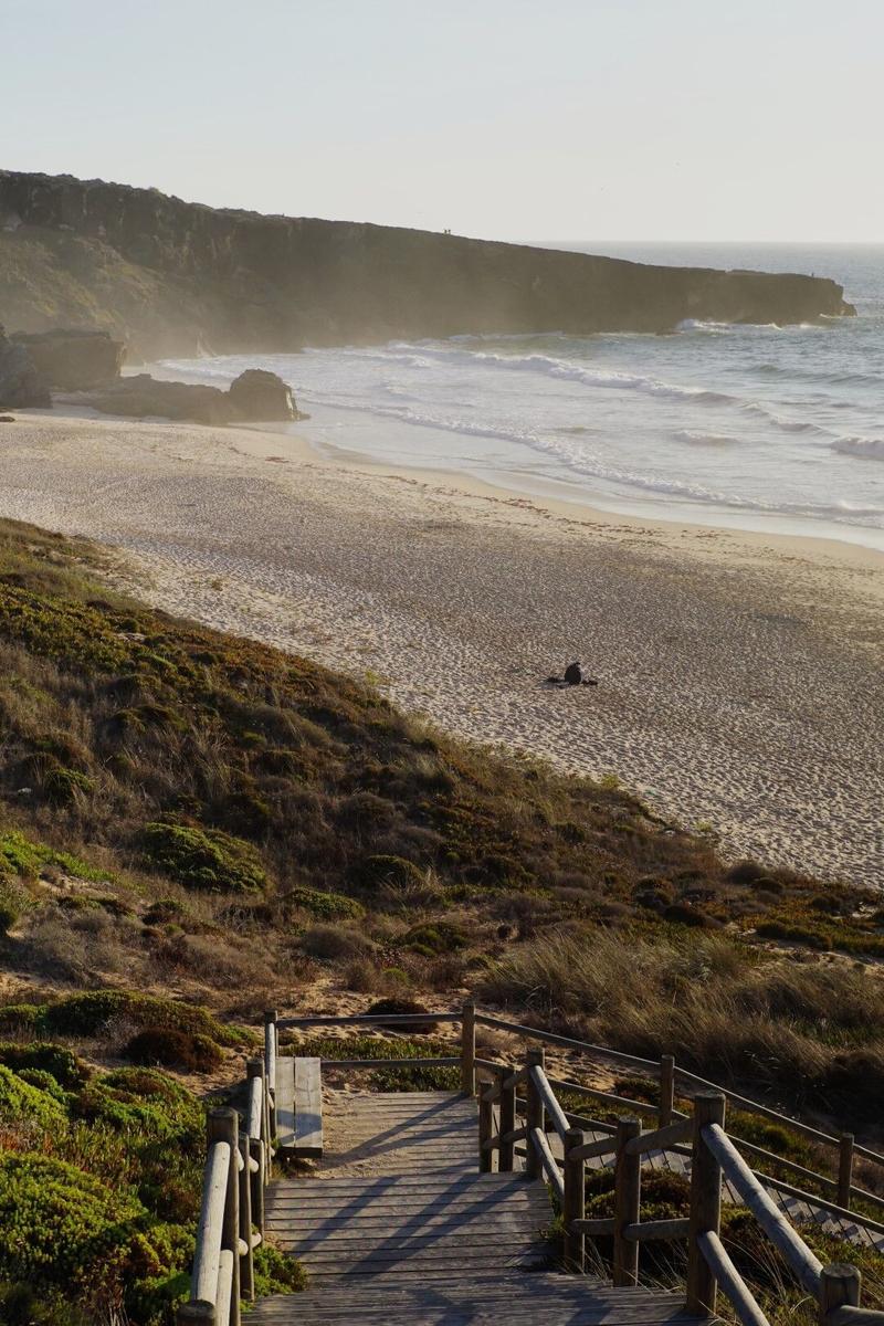 Nous terminons la journée sur une plage, proche de Vila Nova de Milfontes, Malhão, accessible par un long chemin de pierres puis par des escaliers en bois pour descendre la falaise qui l’entoure. C’est magnifique, les plages de la région sont presque vides et invitent à se détendre et à profiter de la vue. Nous repartons peu avant que le soleil se couche pour reprendre le chemin de pierre et rentrer. Cette fois-ci, nous avons retrouvé le logement du premier coup 😉