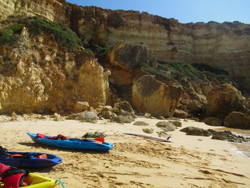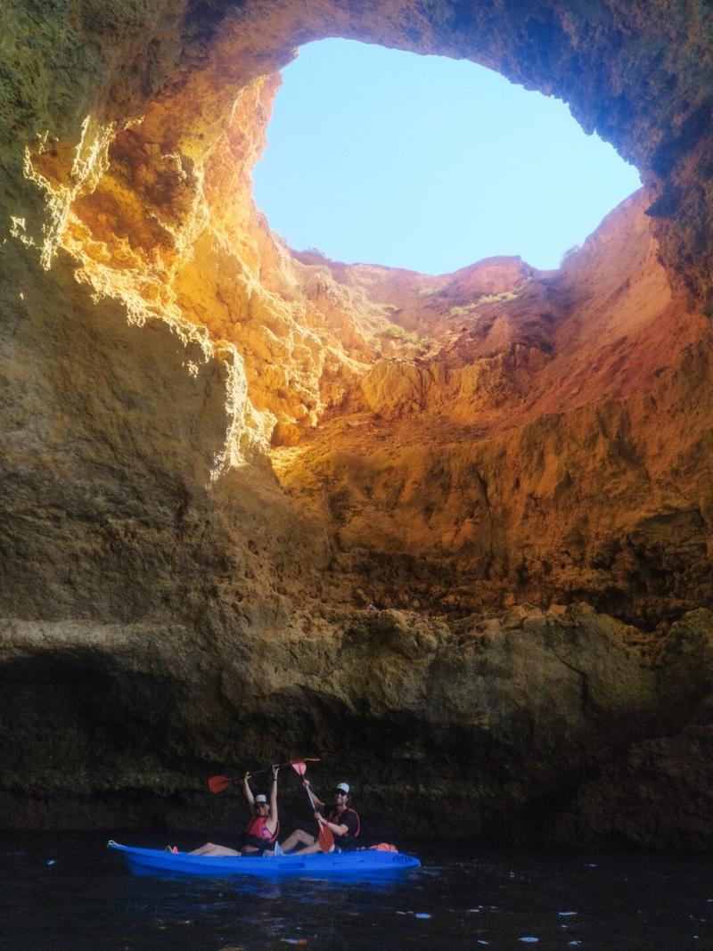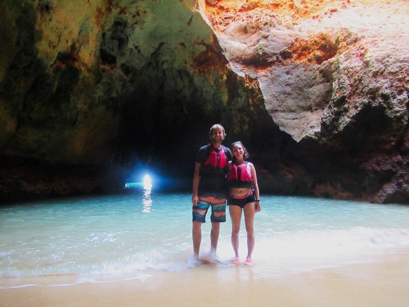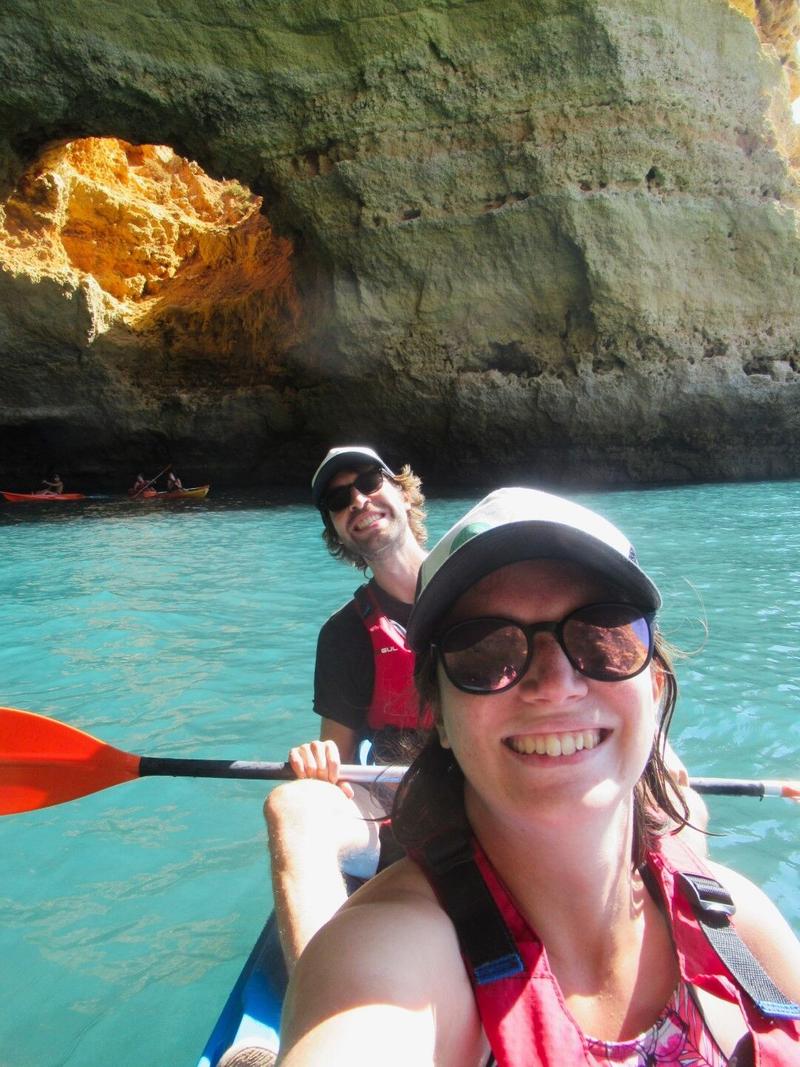 Arrivés sur place, nous avons à faire à 2 joyeux lurons, en pleine forme, qui vont guider notre petit groupe à travers ces fameuses grottes dont on entend parler depuis que nous sommes en Algarve. La balade commence par une file de kayak attachés les uns aux autres, et nous sur l’un deux, tractés par un petit bateau à moteur qui nous emmène bien plus loin, le long des falaises. Comme nous ne devons pas encore pagayer, cela nous laisse le temps d’admirer les hautes falaises qui forment le littoral, depuis la mer. Un point de vue complètement différent de celui que nous avions eu lors de la randonnée des sept vallées et tout aussi impressionnant.